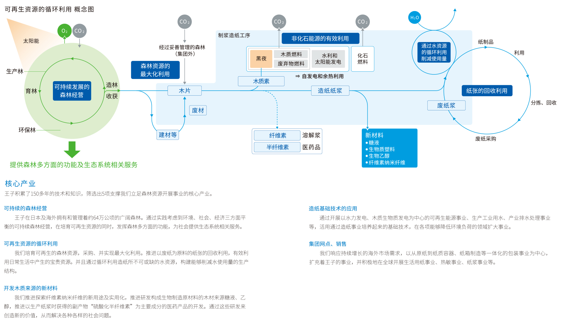 作為王子發(fā)展基礎(chǔ)的造紙行業(yè)是由實(shí)踐可持續(xù)森林經(jīng)營的“森林再循環(huán)”、削減取水量和凈化排水的“水資源再循環(huán)”以及將廢紙?jiān)俅钨Y源化的“紙張?jiān)傺h(huán)”3大資源的再生循環(huán)支撐發(fā)展起來的。我們通過將這樣的經(jīng)營模式進(jìn)行全球化的推廣,使事業(yè)本身的發(fā)展能夠?yàn)闃?gòu)建可持續(xù)發(fā)展的社會(huì)作出貢獻(xiàn)。